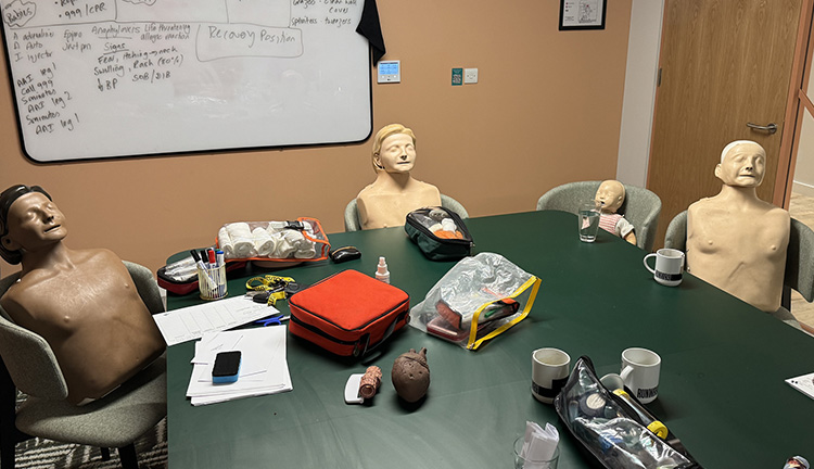 For one day, the meeting room was transformed into a first-aid training ground where – surrounded by body parts (plastic) and Annie dolls – Jacob Dolan, Graeme Beaty, James Taylor, Debbie Jackson, Jo Dalley, Rebecca Maude, and Dawn Pughe-Jones learned essential first-aid skills.
